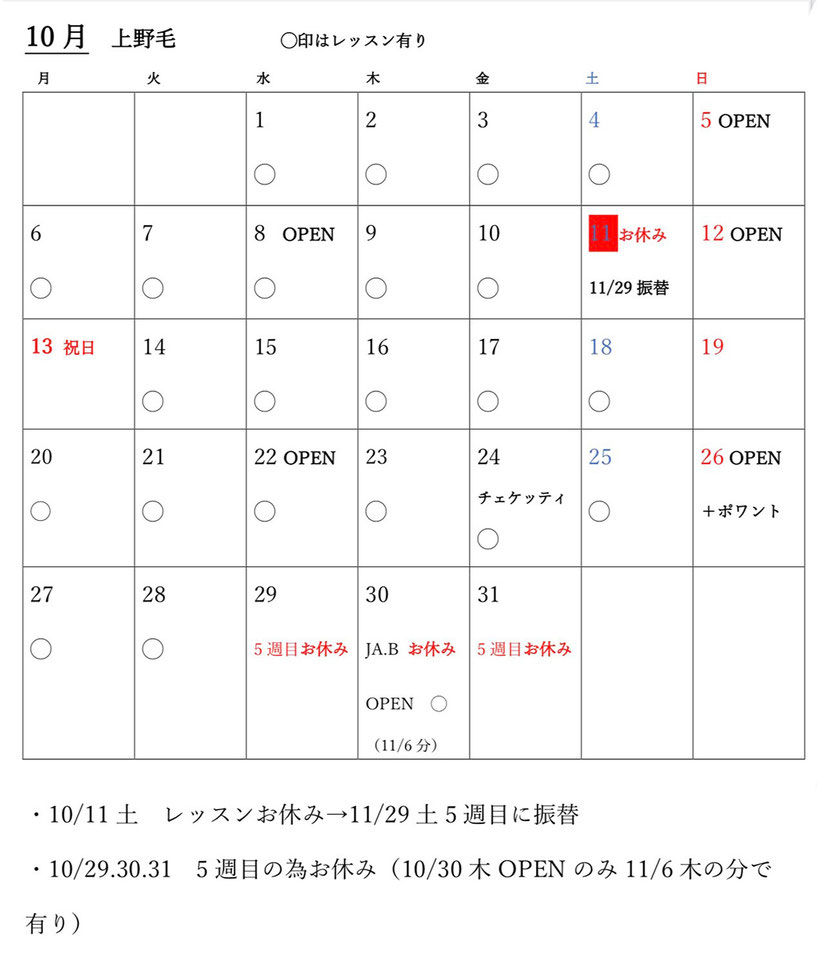 ※9/30(火)5週目ですが、4週目が祝日の為レッスン有りです。